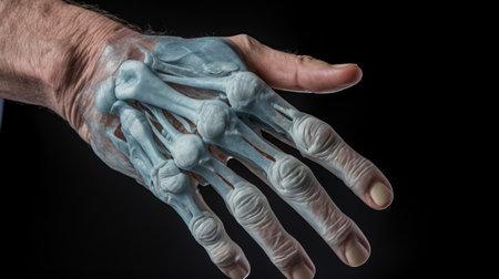 A close-up of a human hand, highlighting the bones and tendons beneath the skin in a detailed and anatomically accurate view.