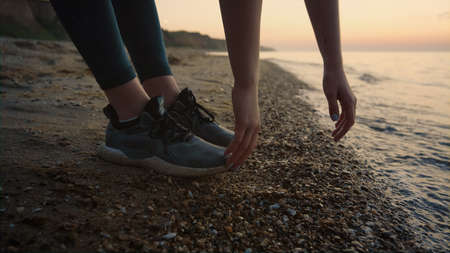 Unknown sportswoman reaching hands to ground standing on wet sand outdoors close up. Sporty woman bending body forward stretching at sunset. Unrecognizable slim girl training near ocean waves.