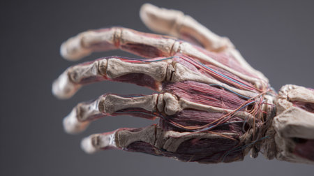 This image presents a detailed view of a human hand anatomy, showcasing intricate muscles, bones, and vascular structures. Ideal for educational and medical use.