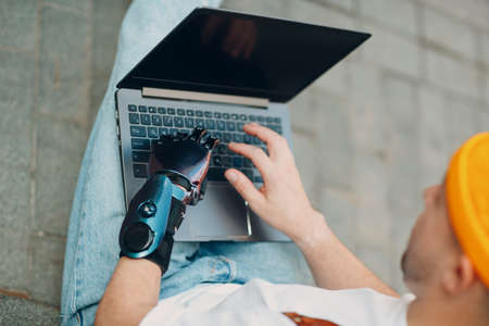 Young disabled man with artificial prosthetic hand using typing on laptop keys computer keyboard