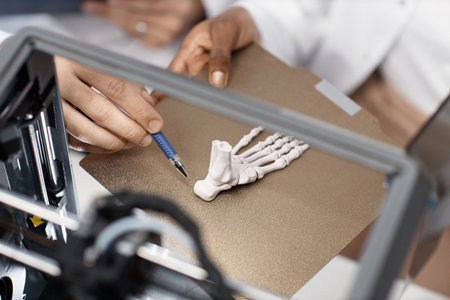 Close up shot of unrecognizable technicians hand pointing pen at calcaneus of printed 3D foot bone on aluminum print bed