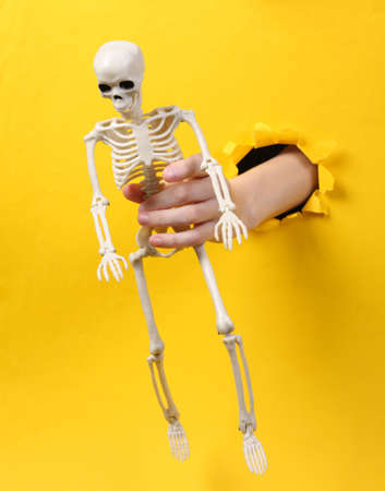 Female hand holds skeleton through torn hole yellow paper. Halloween. concept art. minimalism