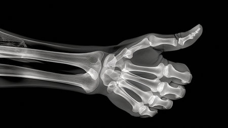 This detailed x-ray image showcases the human arm and hand, highlighting the bone structure and joints. It serves as a valuable resource for medical education and research.
