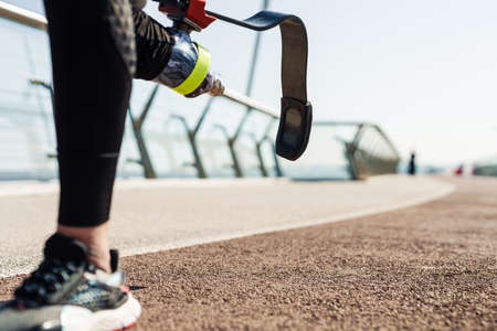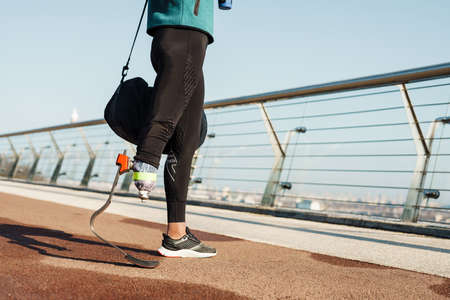 Cropped image of a young disabled woman with prosthetic lag jogging outdoors