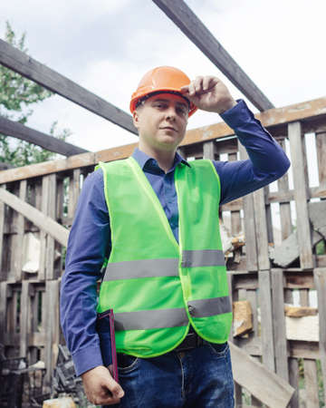 building inspector. Man in a hard hat and a yellow reflective vest examines damaged structures and inspects the building. damage assessment. Preparing for the repair or construction of a building