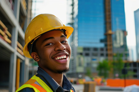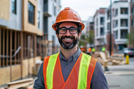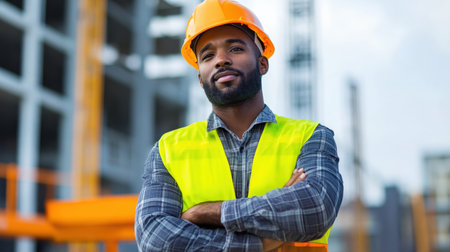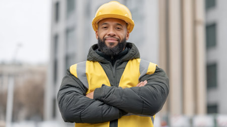 A confident construction worker stands proudly in a hard hat and safety vest at an outdoor site, embodying professionalism and dedication to his trade in an urban setting.
