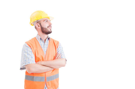 Successful builder or engineer looking up right isolated on white background with copy space or text area