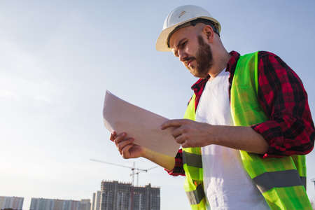 Portrait of Young Man Engineer In Green Vest With Plan