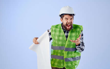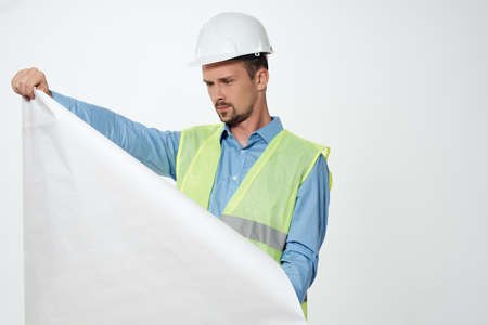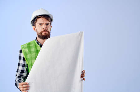 engineer in a white helmet blueprints Professional light background