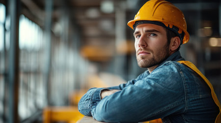 A construction worker wearing a hard hat and denim jacket leans against a railing gazing thoughtfully into the distance at a construction site. The bright orange safety vest indicates his active role amidst a busy environment. Surrounding him steel beams and machinery highlight the ongoing work while natural light filters through the large windows creating a warm atmosphere