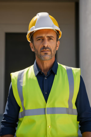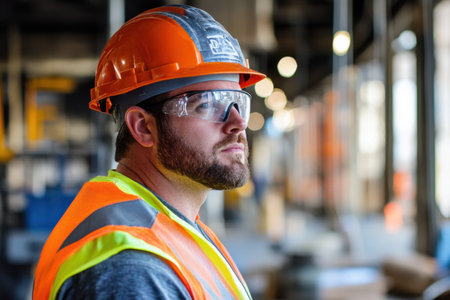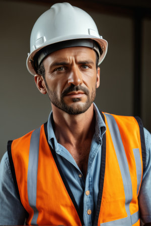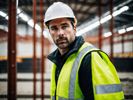Foreman worker wearing a helmet and vest displaying confidence and professionalism in a well-lit indoor environment