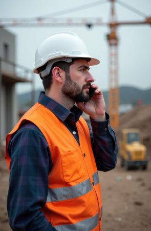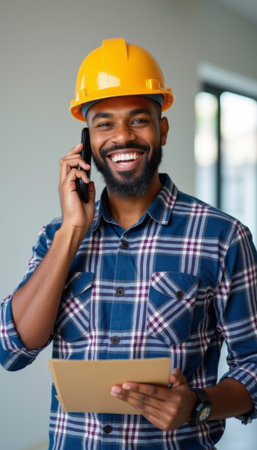 Smiling construction worker in a hard hat on the phone