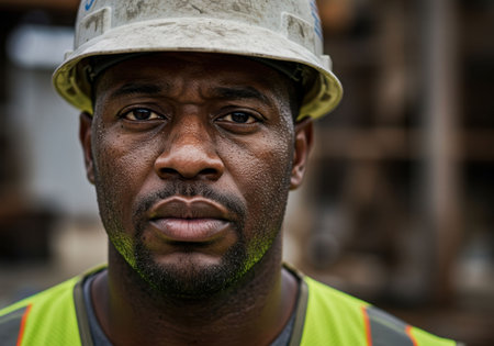 Portrait of an African American construction worker in a hard hat and safety vest after a hard day of work. Manual labor concept