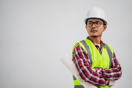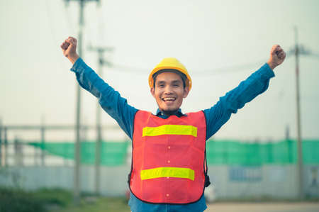 Asian Engineer standing outdoor on site construction posting confident , Engineer construction happy job success with in target planning