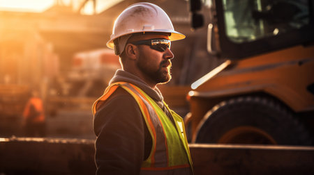 A construction worker wearing safety gear while operating heavy machinery on construction site.
