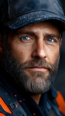 Rugged man with beard and piercing blue eyes