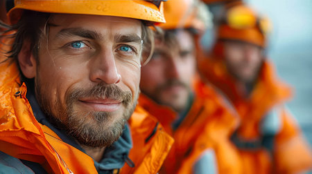 Construction workers wearing protective equipment in foggy conditions at industrial site. for workplace safety, construction industry, teamwork concepts.