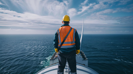 engineer on top of a turbine, with panoramic view of the ocean generative ai