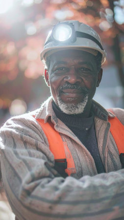 A close-up portrait of a smiling senior African miner wearing a hard hat with a lit headlamp and an orange safety vest, with his arms crossed in an outdoor setting. High quality photo