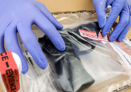 Scientific Police opens evidence bag with firearm in Laboratorio forensic equipment, conceptual image