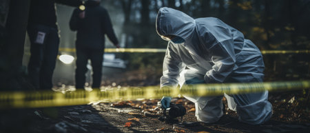 Forensic investigators in hazmat suits gathering evidence behind yellow crime scene do not cross tape, working diligently to process an area of investigation for law enforcement