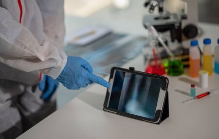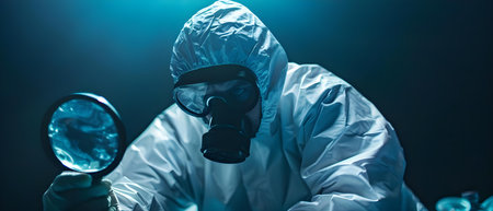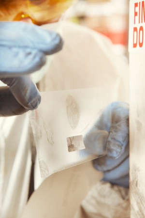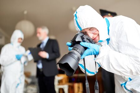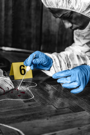 Close-up of a forensic scientist in a protective suit and gloves making a crime scene.