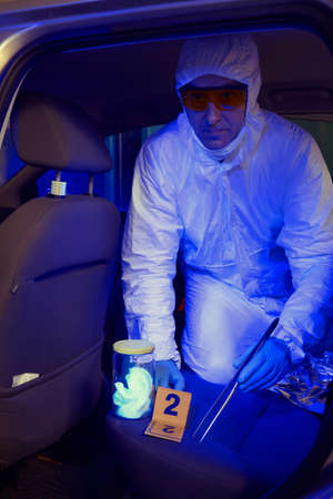 Crime investigation - collecting of odor traces in suspected car in police garage under UV light