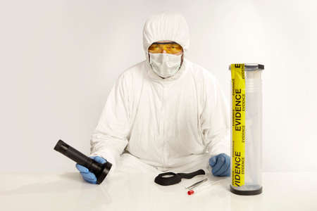 An expert is gathering evidence at a crime scene. The law and the concept of police forensics
