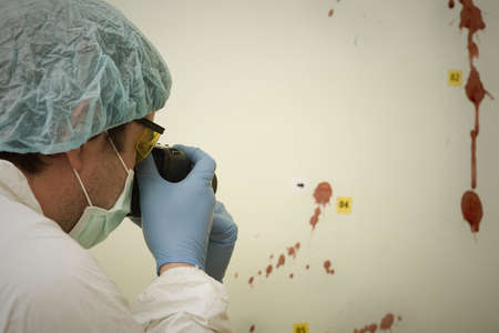 Crime scene for cutting weapon, Judicial police takes blood samples in scene of murder, conceptual image, conceptual image