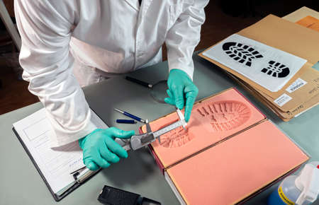 Forensic scientist investigates shoeprint mould evidence in crime lab, conceptual image