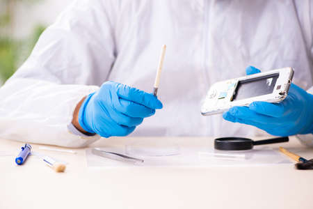 Digital Forensic Science. Police Forensic Analyst Examining Confiscated Mobile Phone.