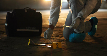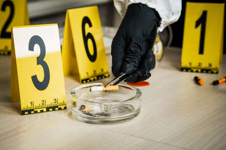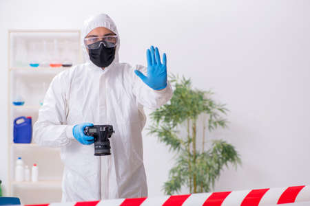 Male criminologist in protective suit and latex gloves explore evidence at the crime scene