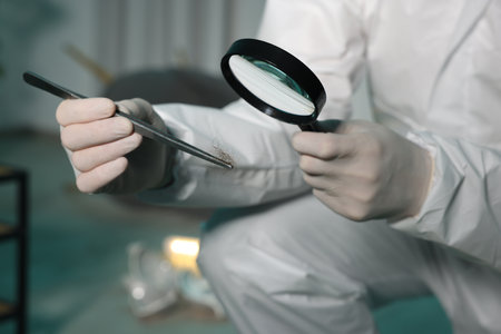 Focused forensic investigator examining evidence with magnifying glass at crime scene with colleagues working behind