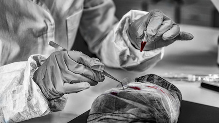 Criminalistics police write victim's details in bloodstained gauze murder, conceptual image