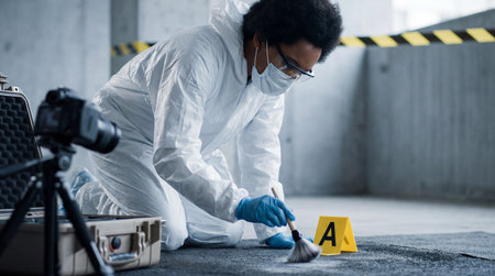 Meticulous forensic investigator in protective suit collecting crime scene evidence indoors with brush near numbered marker and camera case.