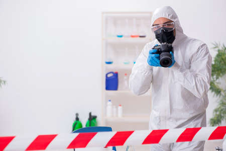 An expert is gathering evidence at a crime scene. The law and the concept of police forensics
