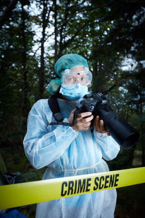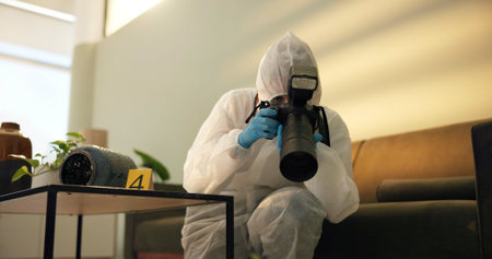 Forensic Investigator Documenting Crime Scene Evidence with Camera and Protective Gear for Analysis