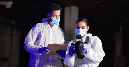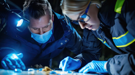 A pair of dedicated forensic investigators inspect evidence meticulously at a crime scene during nighttime. They utilize a flashlight and wear protective gear, indicating focus and professionalism in their work.