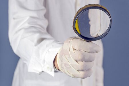 Lab technician holding a magnifying glass while working in the laboratory, research in the laboratory. Selective focus.