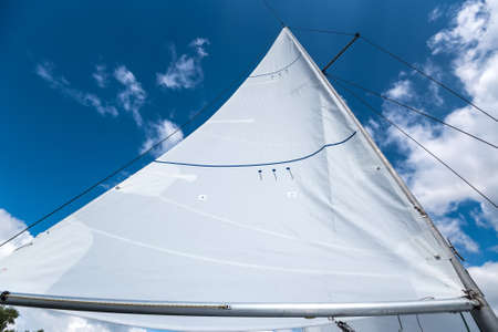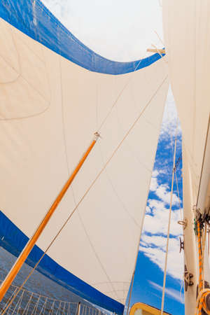 Sail on sky background, part of luxury water transport, summer adventure on sailboat, freedom and active lifestyle concept