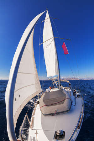 View from the mast down to the bow of a sailing yacht moving under full sails near Croatia. Freedom, adventure, yachting lifestyle and dynamic sea travel. High quality photo
