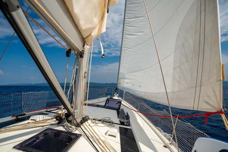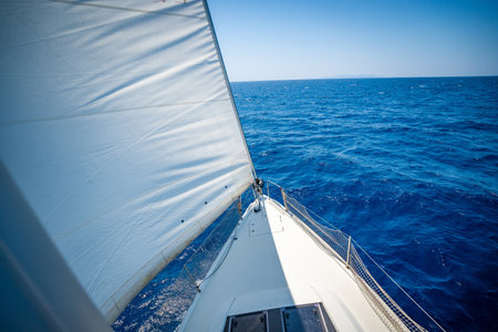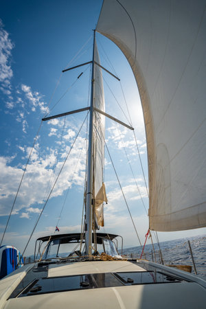 White sails filled with wind, seen from the bow of a sailing yacht near Croatia. Freedom, clean energy, adventure and mindful travel on the open sea. High quality photo