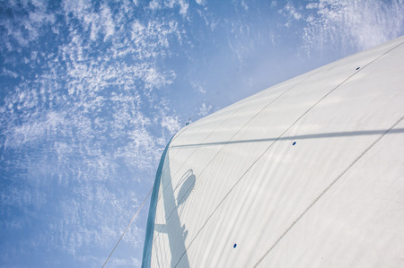 Spinnaker with uphaul on sail boat, blue sky in background. Marine sailing objects concept.