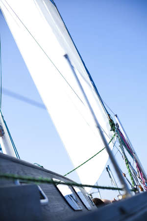 Detailed closeup of sail fabric on sailboat, outdoor shot. Marine objects concept.