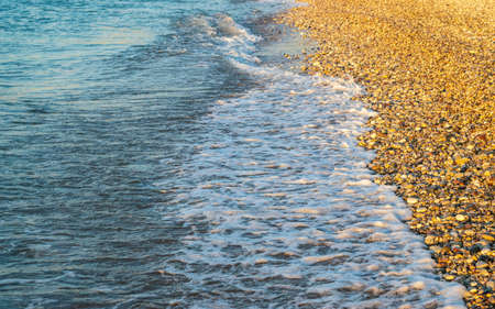 Sea waves on pebble beach texture background. Transparent ocean water, rocky shore pattern, summer mockup with copy space, stone shoreline, vacation concept