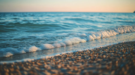 Captivating beach landscape featuring gentle waves lapping against a serene shoreline during sunset. Ideal for travel, nature, and relaxation themes.