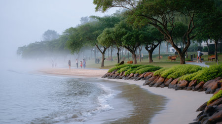 A tranquil beachfront scene captured in the early morning, featuring misty waters, lush greenery, and people enjoying a peaceful stroll along the sandy shore.