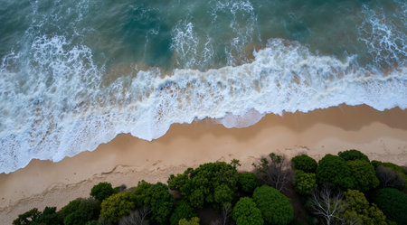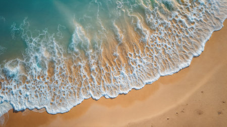 White sea foam creates soothing patterns as it washes onto the beach, offering a tranquil seaside view. Ai generated image