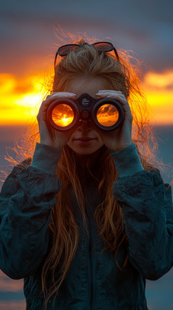 The image captures a young woman with long hair looking through binoculars, reflecting a beautiful sunset, symbolizing curiosity and wonder in nature's beauty.