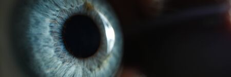 Male blue eye closup super macro background. Selection of glasses and contact lenses concept